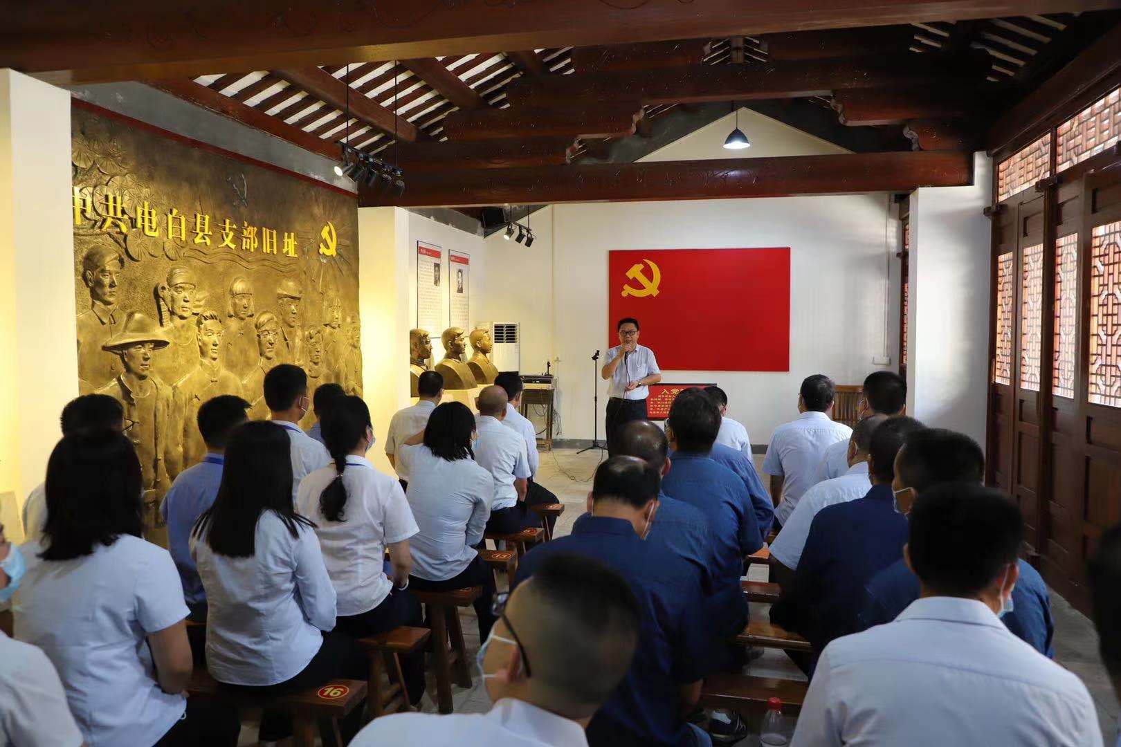 展廳內,一件件展品,一張張照片,一段段史實讓大家仿佛回到了那段激情燃燒的歲月。參觀活動的人員不時停下腳步仔細觀看,認真聽取講解員的講解,深刻認識到紅色政權來之不易,新中國成立不容易,今天的幸福生活更是來之不易。隨后,在中共電白縣支部舊址大廳,集團黨委書記、董事長黃遠維帶領集團黨員干部職工面向鮮紅的中國共產黨黨旗,舉起右拳,重溫入黨誓詞,鏗鏘有力的宣誓響徹大廳。